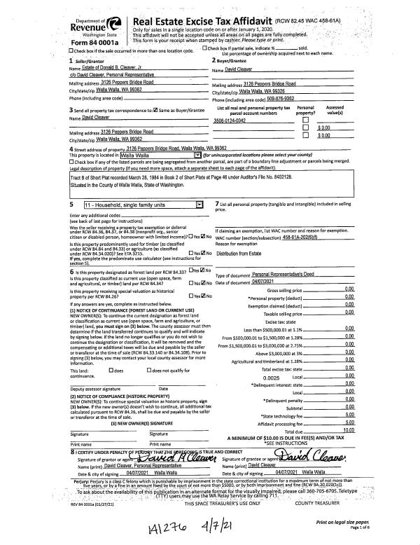 | 1 | 04/07/2021 | DPR | DEED OF PERSONAL REPRESENTATIVE | CLEAVER DONALD B JR | CLEAVER DAVID A | | | $0.00 | 141276 | 2021-04039 |