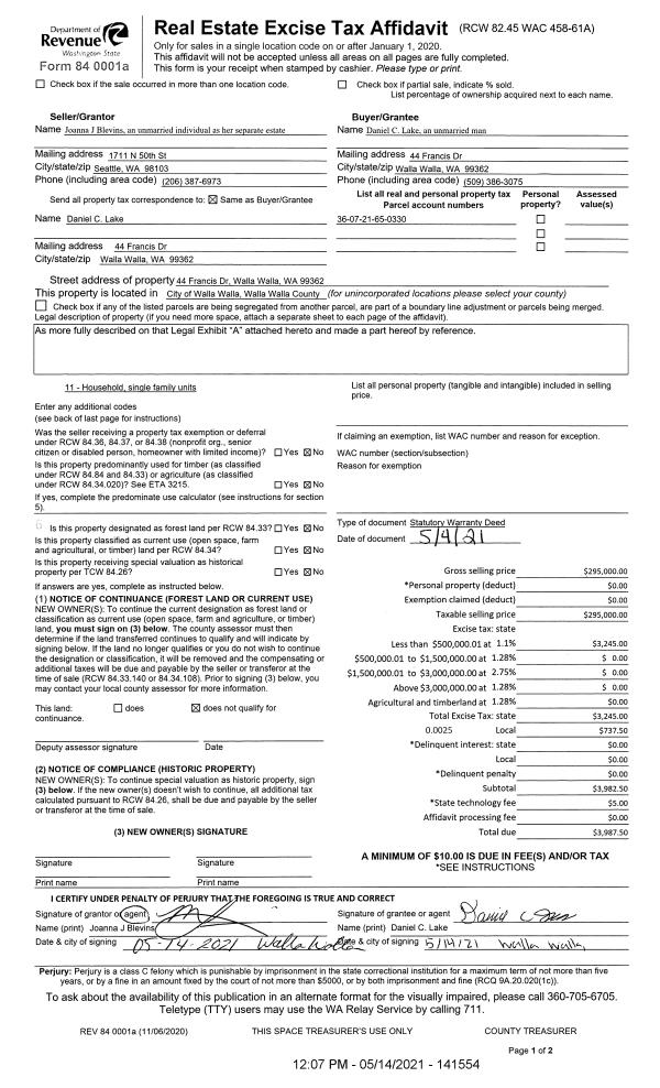 | 1 | 05/14/2021 | SWD | STATUTORY WARRANTY DEED | BLEVINS JOANNA J | LAKE DANIEL C | | | $295,000.00 | 141554 | 2021-05811 |
