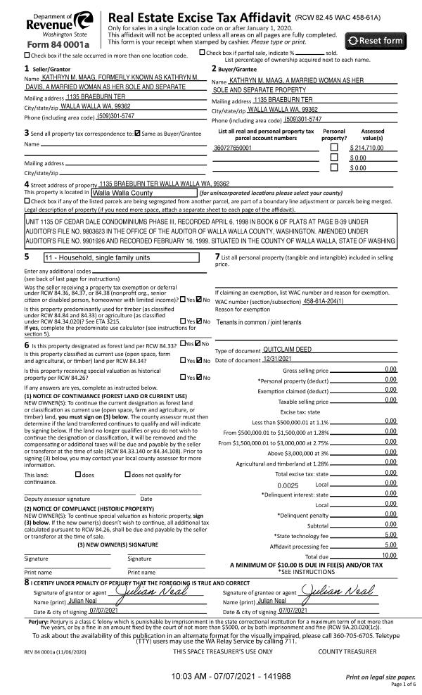 | 1 | 12/31/2020 | QCD | QUIT CLAIM DEED | DAVIS-MAAG KATHYRN M | MAAG KATHRYN M | | | $0.00 | 141988 | 2021-08212 |
