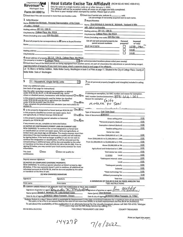 | 1 | 07/12/2022 | QCD | QUIT CLAIM DEED | KIMBALL LOTTIE JEAN ESTATE OF | MCINTOSH ORON & JEANNIE M | | | $0.00 | 144278 | 2022-05875 |