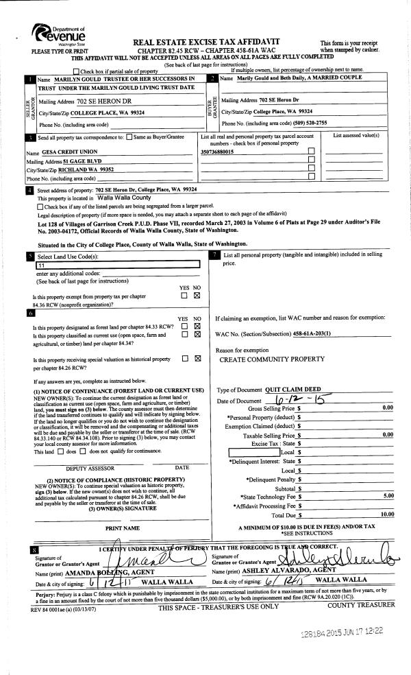 | 2 | 06/12/2015 | QCD | QUIT CLAIM DEED | GOULD MARILYN LIVING TRUST | GOULD MARILYN | | | | 128184 | 2015-05070 |