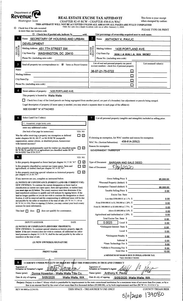 | 1 | 05/11/2020 | BARGAIN & | BARGAIN & SALE DEED | SECRETARY OF HOUSING & URBAN DEVELOPMENT | PAVLIC ANTHONY K | | | $95,000.00 | 139080 | 2020-04053 |