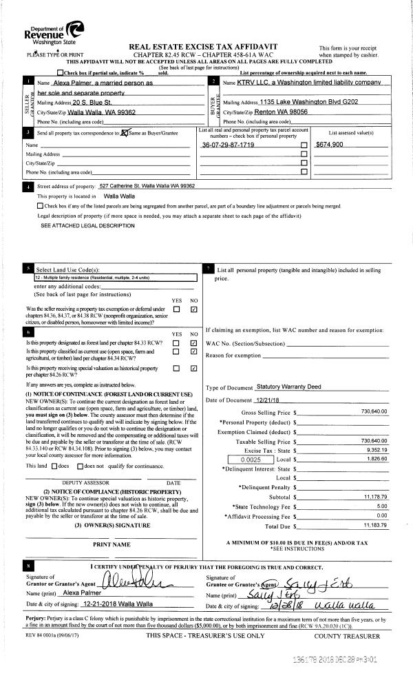 | 1 | 12/28/2018 | SWD | STATUTORY WARRANTY DEED | PALMER ALEXA | KTRV LLC | | | $730,640.00 | 136178 | 2018-10696 |
