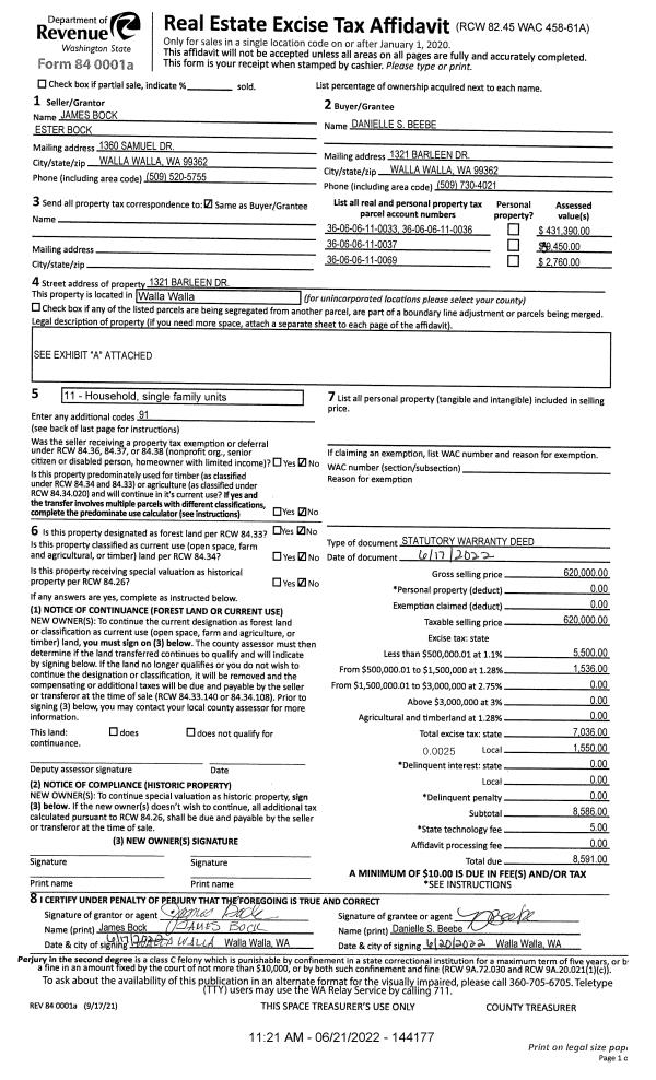 | 1 | 06/21/2022 | SWD | STATUTORY WARRANTY DEED | BOCK JAMES & ESTER | BEEBE DANIELLE S | | 4-PARCELS | $620,000.00 | 144177 | 2022-05207 |