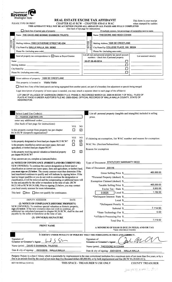 | 2 | 04/01/2016 | SWD | STATUTORY WARRANTY DEED | SHANNON DAVID S TRUST | COHAN THEODORE W & HEIDI R | | | $465,000.00 | 129939 | 2016-02401 |