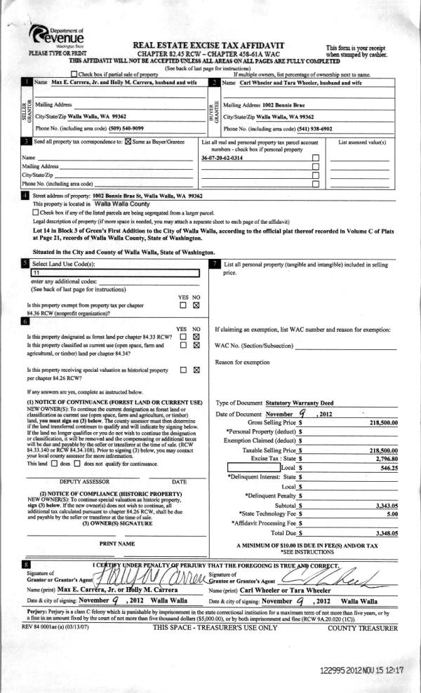 | 2 | 11/15/2012 | WARRANTY D | WARRANTY DEED | CARRERA, MAX E JR & HOLLY M | WHEELER, CARL & TARA | | | $218,500.00 | 122995 | 2012-10077 |