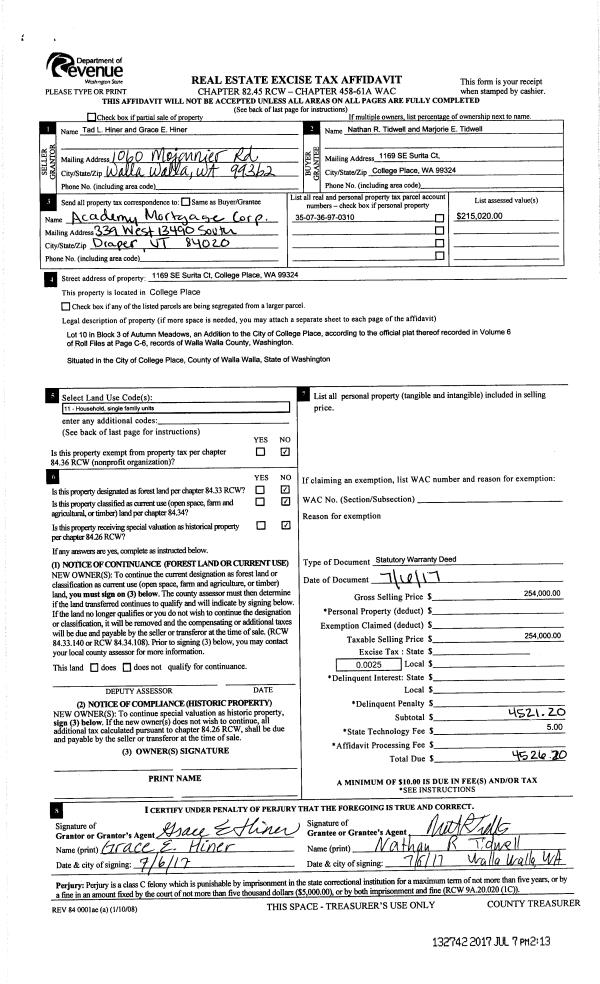 | 1 | 07/07/2017 | SWD | STATUTORY WARRANTY DEED | HINER TAD L & GRACE E | TIDWELL NATHAN & MARJORIE | | | $254,000.00 | 132742 | 2017-05223 |