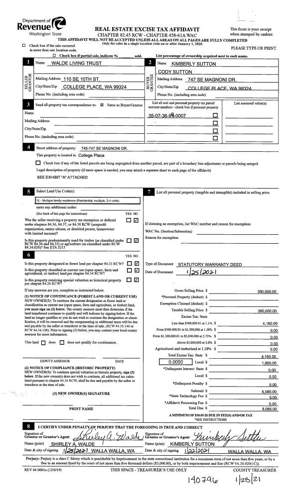 | 2 | 01/25/2021 | SWD | STATUTORY WARRANTY DEED | WALDE LIVING TRUST | SUTTON KIMBERLY & CODY | | | $380,000.00 | 140796 | 2021-00969 |