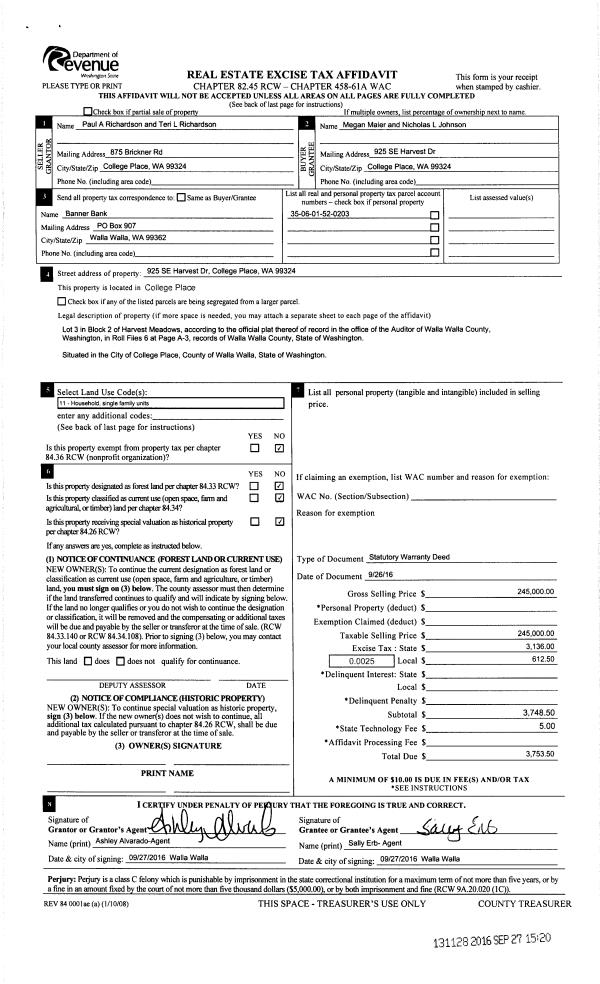 | 1 | 09/27/2016 | SWD | STATUTORY WARRANTY DEED | RICHARDSON PAUL A & TERI L | MAIER MEGAN T | | | $245,000.00 | 131128 | 2016-07933 |