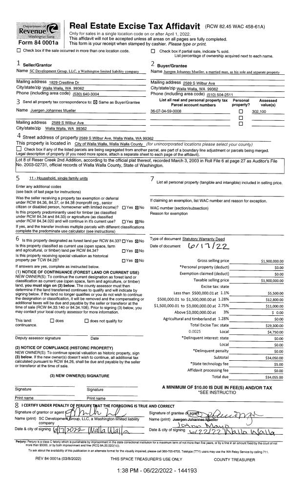 | 2 | 06/22/2022 | SWD | STATUTORY WARRANTY DEED | SC DEVELOPMENT GROUP LLC | MUELLER JUERGEN JOHANNES | | | $1,900,000.00 | 144193 | 2022-05273 |
