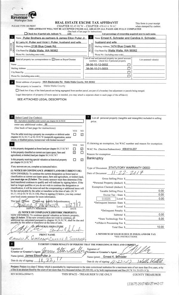 | 1 | 11/22/2017 | SWD | STATUTORY WARRANTY DEED | PULLER BROTHERS | SCHRADER ERNEST & CANDICE | | | $0.00 | 133675 | 2017-09491 |