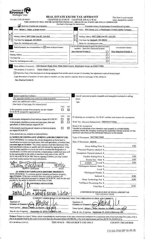 | 4 | 09/23/2016 | DPR | DEED OF PERSONAL REPRESENTATIVE | KELLER MIRIAM L | KK4 FARMS INC | | | $0.00 | 131166 | 2016-08058 |