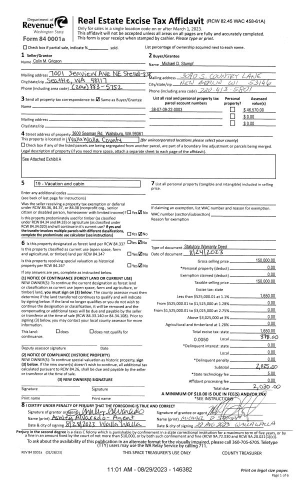 | 1 | 08/29/2023 | SWD | STATUTORY WARRANTY DEED | GRIGSON COLIN M | STUMPF MICHAEL D | | | $150,000.00 | 146382 | 2023-05001 |