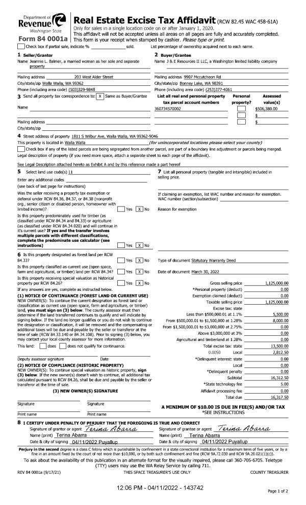 | 1 | 04/11/2022 | SWD | STATUTORY WARRANTY DEED | BALMER JEANNIE L | J & E RESOURCES II LLC | | | $1,125,000.00 | 143742 | 2022-02992 |