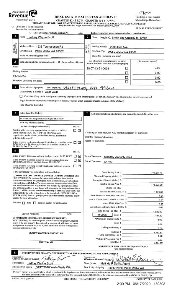 | 1 | 06/17/2020 | SWD | STATUTORY WARRANTY DEED | SCOTT JEFFREY WAYNE | SMITH KEVIN & CHELSEY | | | $175,000.00 | 139303 | 2020-05537 |