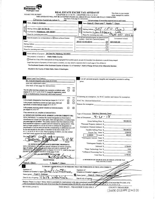 | 1 | 04/12/2018 | SWD | STATUTORY WARRANTY DEED | GRITMAN FRED C | OLSON HANS E & NOELLE T | | | $180,000.00 | 134490 | 2018-02831 |