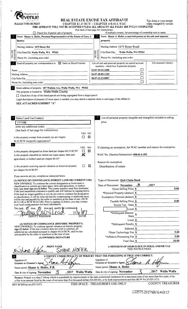 | 2 | 11/03/2017 | QCD | QUIT CLAIM DEED | BUTTICE GARY J | HOFER SHANE A | | | $0.00 | 133575 | 2017-08955 |