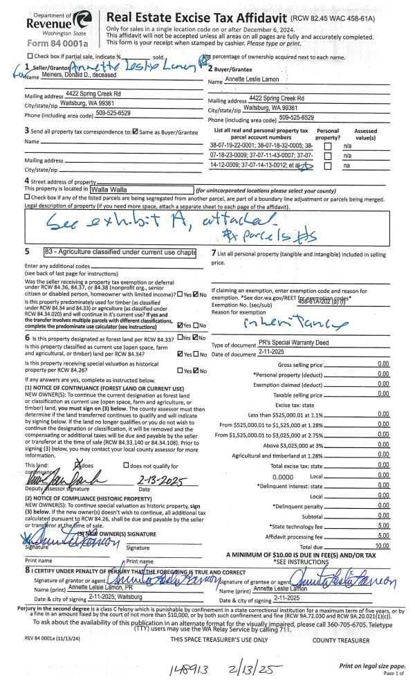 | 1 | 02/13/2025 | DPR | DEED OF PERSONAL REPRESENTATIVE | MEINERS DONALD D | LAMON ANNETTE LESLIE | | | | 148913 | 2025-00732 |