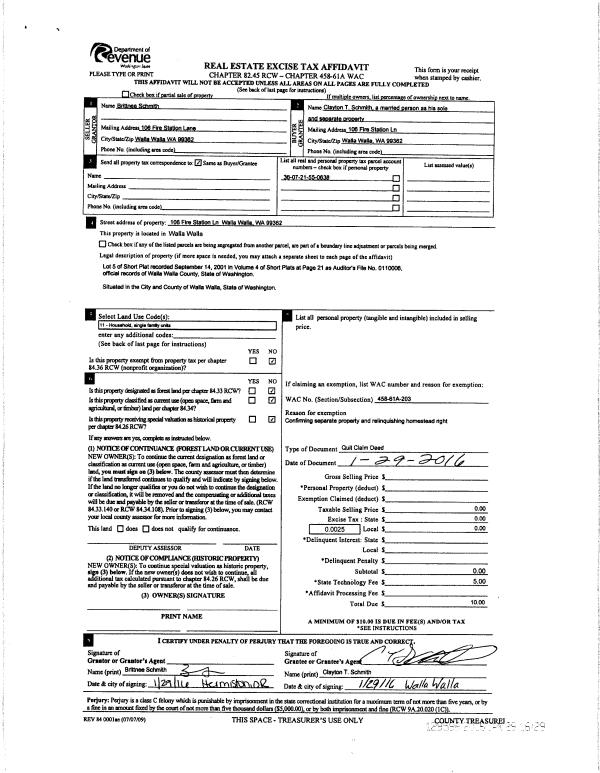 | 4 | 01/29/2016 | QCD | QUIT CLAIM DEED | SCHMITH BRITTNEE | SCHMITH CLAYTON T | | | | 129596 | 2016-00698 |