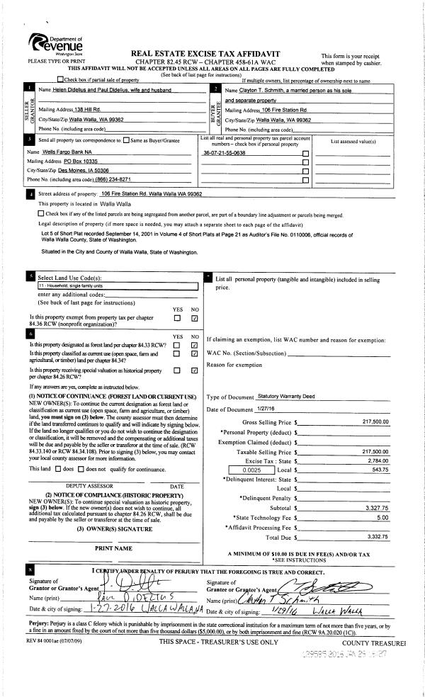 | 5 | 01/29/2016 | SWD | STATUTORY WARRANTY DEED | DIDELIUS PAUL & HELEN | SCHMITH CLAYTON T | | | $217,500.00 | 129595 | 2016-00697 |