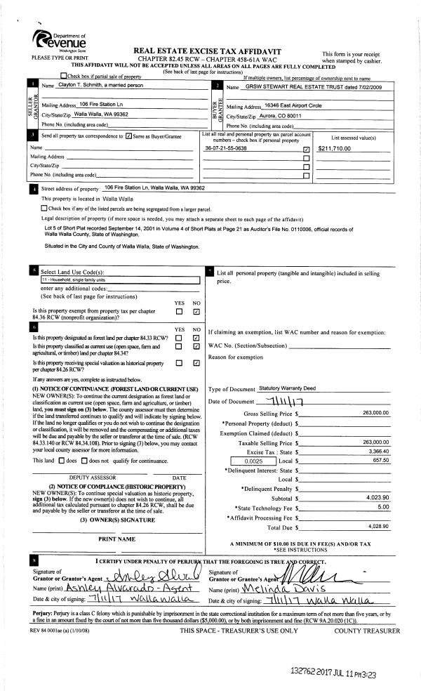 | 3 | 07/11/2017 | SWD | STATUTORY WARRANTY DEED | SCHMITH CLAYTON T | GRSW STEWART REAL ESTATE TRUST | | | $263,000.00 | 132762 | 2017-05315 |