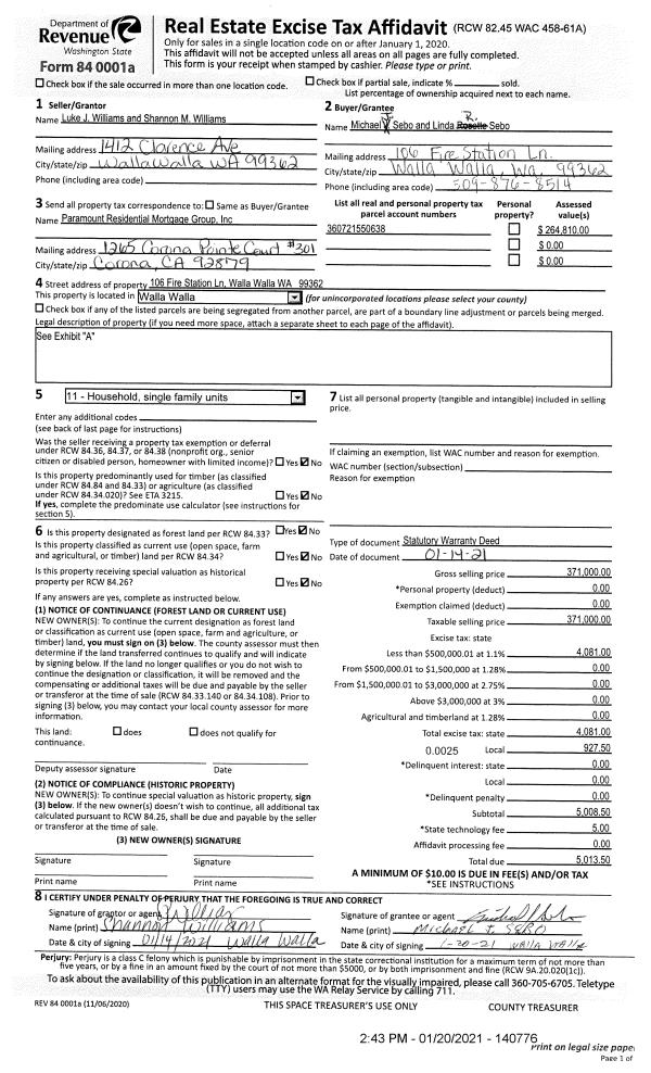 | 1 | 01/20/2021 | SWD | STATUTORY WARRANTY DEED | WILLIAMS LUKE J & SHANNON M | SEBO MICHAEL J & LINDA R | | | $371,000.00 | 140776 | 2021-00790 |