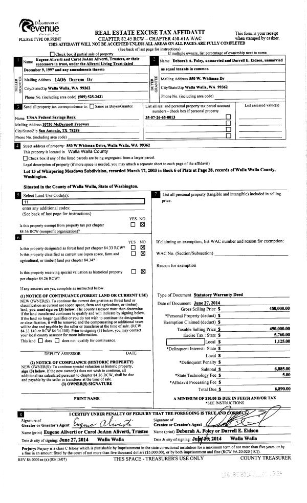| 1 | 07/01/2014 | SWD | STATUTORY WARRANTY DEED | ALIVERTI LIVING TRUST | EIDSON DARRELL E | | | $450,000.00 | 126185 | 2014-04580 |