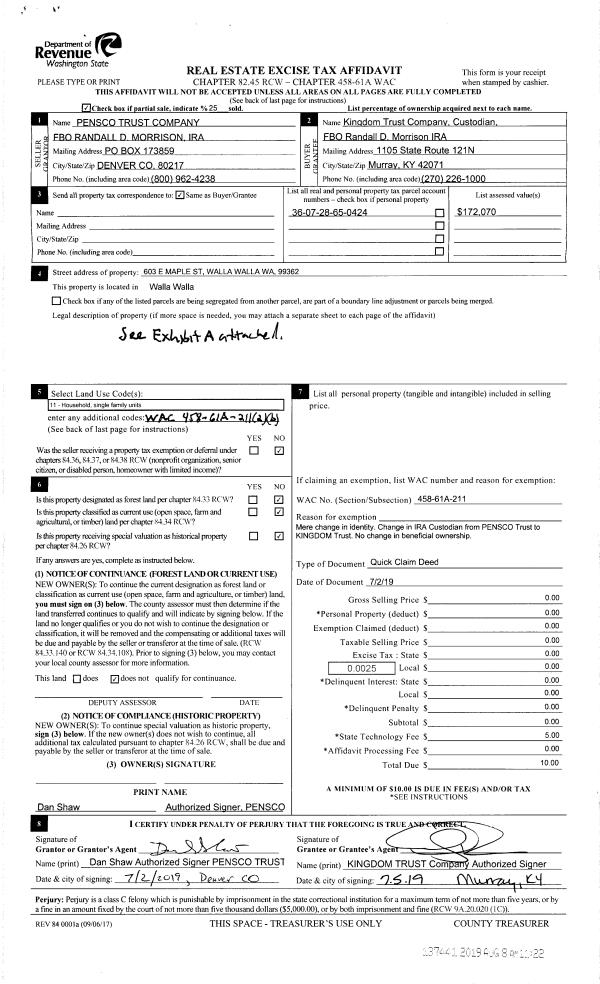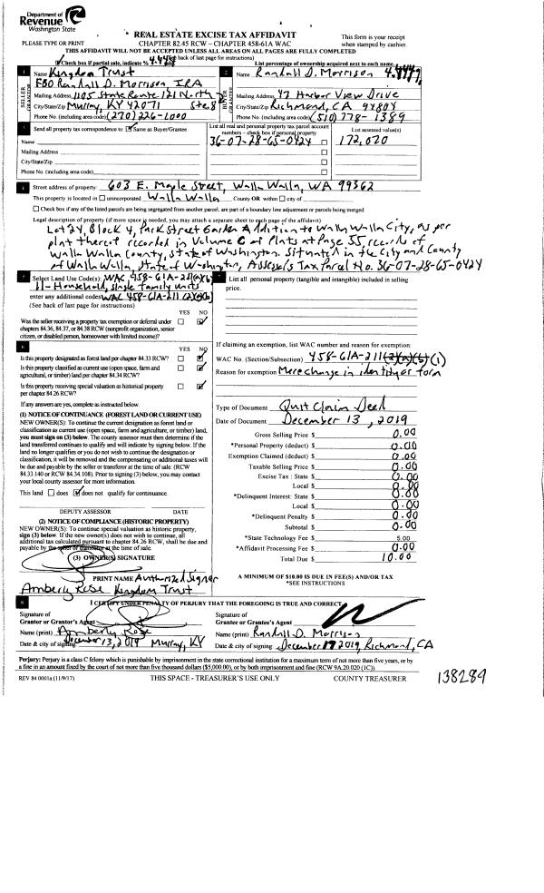| 3 | 12/13/2019 | QCD | QUIT CLAIM DEED | MORRISON RANDALL & MARGARET TRUST | MORRISON RANDAL & MARGARET TRUST 75% ET AL | | | $0.00 | 138289 | 2019-10572 |
