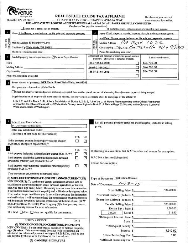 | 3 | 01/13/2015 | REAL ESTAT | REAL ESTATE CONTRACT | ROYSE JOHN | HAYES CHAD | | 3-PARCELS | $125,000.00 | 127259 | 2015-00292 |