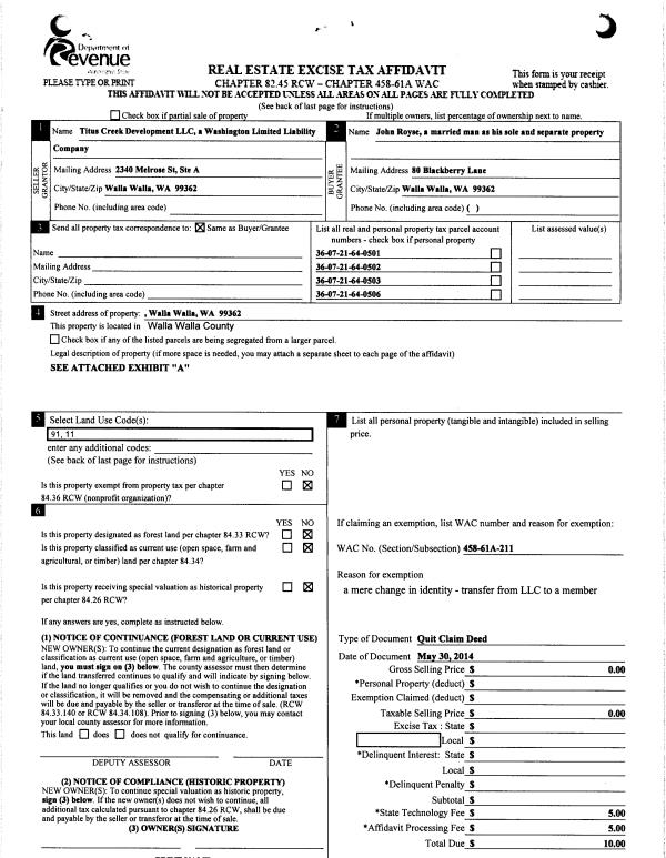 | 4 | 05/30/2014 | QCD | QUIT CLAIM DEED | TITUS CREEK DEVELOPMENT LLC | ROYSE JOHN | | 4-PARCELS | | 125994 | 2014-03724 |