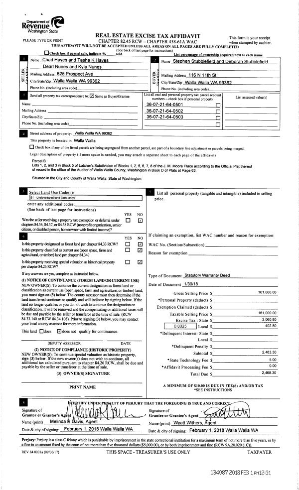 | 1 | 02/01/2018 | SWD | STATUTORY WARRANTY DEED | HAYES CHAD | STUBBLEFIELD STEPHEN & DEBORAH | | 3-PARCELS | $161,000.00 | 134087 | 2018-00891 |