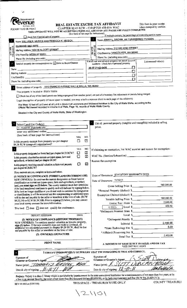 | 2 | 12/08/2011 | WARRANTY D | WARRANTY DEED | MUSICK, WILLIAM R & REBECCA K | BROWN, JENNY L | | | $160,000.00 | 121101 | 2011-09660 |