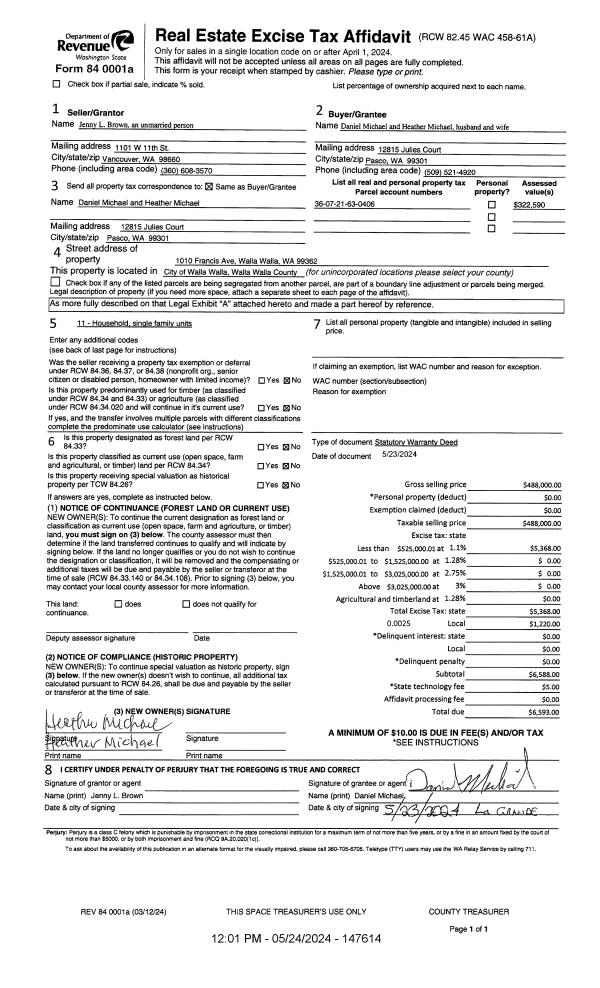 | 1 | 05/24/2024 | SWD | STATUTORY WARRANTY DEED | BROWN JENNY L | MICHAEL DANIEL & HEATHER | | | $488,000.00 | 147614 | 2024-02778 |