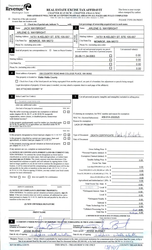 | 4 | | LOPA | LACK OF PROBATE AFFIDAVIT | WAYBRIGHT JACK FRANCIS | WAYBRIGHT ARLENE G | | | | 0 | SEE IMAGES |
