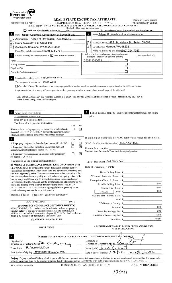 | 3 | 01/09/2020 | QCD | QUIT CLAIM DEED | UPPER COLUMBIA CORP OF SDA | WAYBRIGHT ARLENE G | | | $0.00 | 138411 | 2020-00306 |