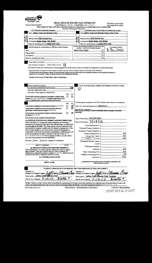 | 1 | 07/14/2015 | QCD | QUIT CLAIM DEED | CRISS JEFF & BRENDA | CRISS JEFFREY & BRENDA LIVING TRUST | | | $0.00 | 128387 | 2015-06019 |
