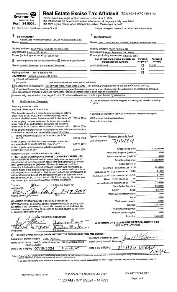 | 1 | 07/18/2024 | SWD | STATUTORY WARRANTY DEED | GOLDEN LAND PROPERTIES INVESTMENT LLC | BLACKMAN LORNE D & AURALEA C | | | $100,000.00 | 147893 | 2024-03893 |