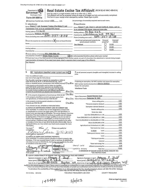 | 3 | 03/10/2023 | SWD | STATUTORY WARRANTY DEED | LEID MICKEY TESTAMENTARY TRUST ETAL | LEID GREGORY P ET AL | | | | 145499 | 2023-01230 |