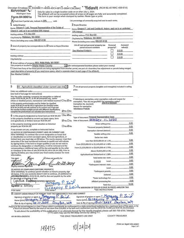 | 1 | 10/24/2024 | DPR | DEED OF PERSONAL REPRESENTATIVE | LEID GREGORY P ET AL | LEID GREGORY P ET AL | | | | 148415 | 2024-06200 |