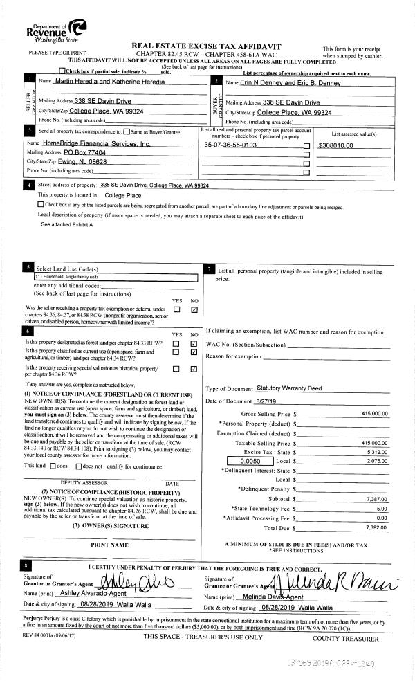 | 1 | 08/28/2019 | SWD | STATUTORY WARRANTY DEED | HEREDIA MARTIN & KATHERINE L | DENNEY ERIN N & ERIC B | | | $415,000.00 | 137569 | 2019-06637 |