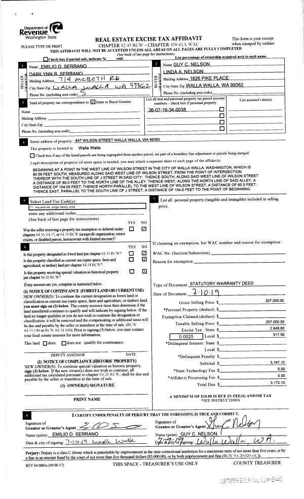 | 1 | 07/11/2019 | SWD | STATUTORY WARRANTY DEED | SERRANO EMILIO D & DARILYNN R | NELSON GUY C & LINDA A | | | $207,000.00 | 137259 | 2019-04953 |