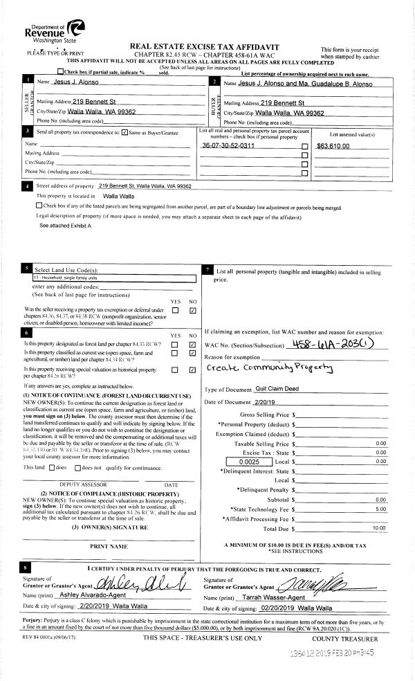 | 1 | 02/20/2019 | QCD | QUIT CLAIM DEED | ALONSO JESUS | ALONSO JESUS J & MA GUADALUPE B | | | $0.00 | 136412 | 2019-01117 |