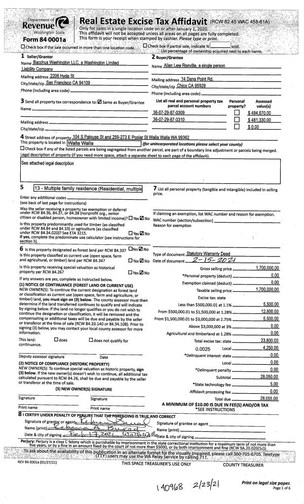 | 2 | 02/23/2021 | SWD | STATUTORY WARRANTY DEED | BACCHUS WASHINGTON LLC | RENVILLE ALLEN LEW | | 2-PARCELS | $1,700,000.00 | 140968 | 2021-02105 |