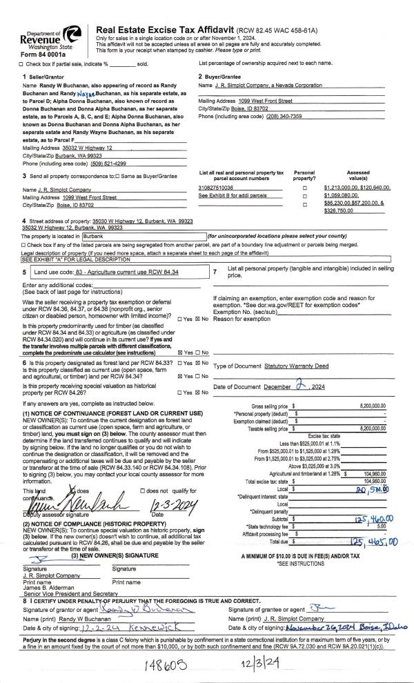 | 1 | 12/03/2024 | SWD | STATUTORY WARRANTY DEED | BUCHANAN DONNA | J R SIMPLOT COMPANY | | 6-PARCELS | $8,200,000.00 | 148605 | 2024-06979 |