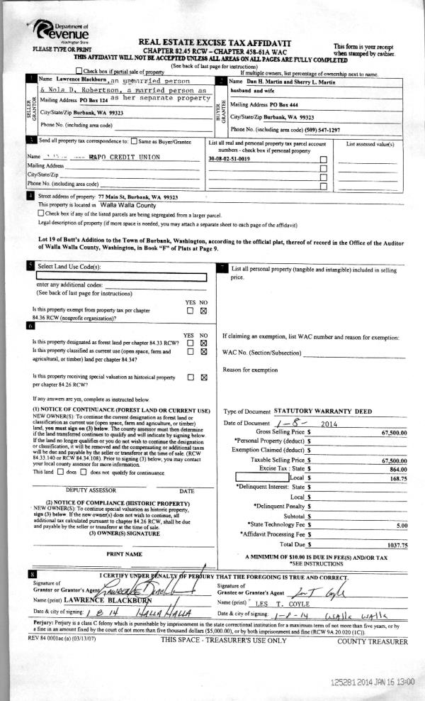 | 3 | 01/16/2014 | WARRANTY D | WARRANTY DEED | BLACKBURN LAWRENCE | MARTIN DAN H & SHERRY L ESTATE OF | | | $67,500.00 | 125281 | 2014-00360 |