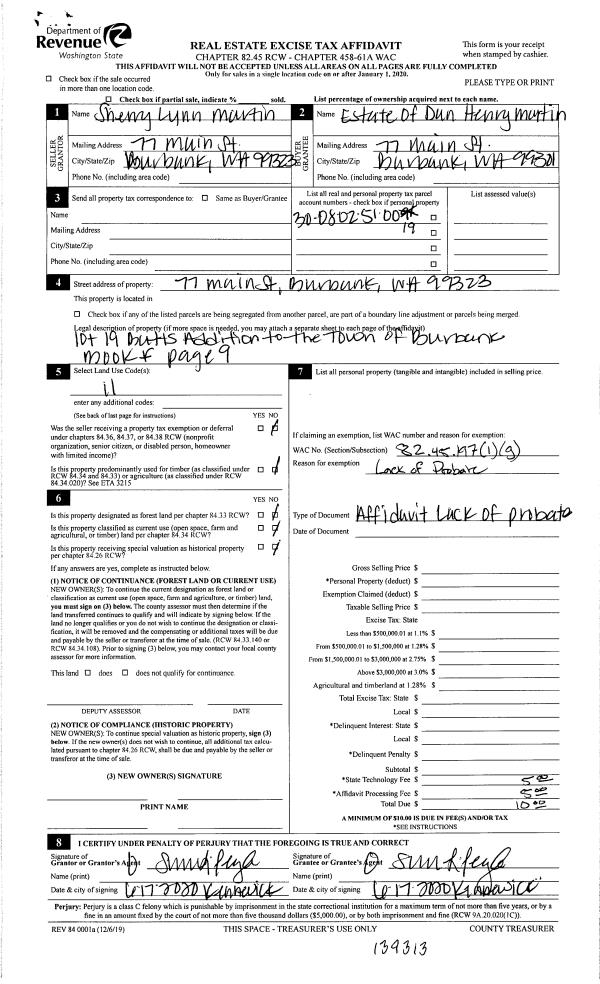 | 2 | 06/19/2020 | LOPA | LACK OF PROBATE AFFIDAVIT | MARTIN DAN H & SHERRY L ESTATE OF | MARTIN DAN HENRY ESTATE OF | | | $0.00 | 139313 | 2020-05623 |