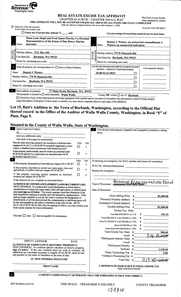 | 1 | 06/19/2020 | DPR | DEED OF PERSONAL REPRESENTATIVE | MARTIN DAN HENRY ESTATE OF | WATERS BONNIE J | | | $82,400.00 | 139314 | 2020-05624 |