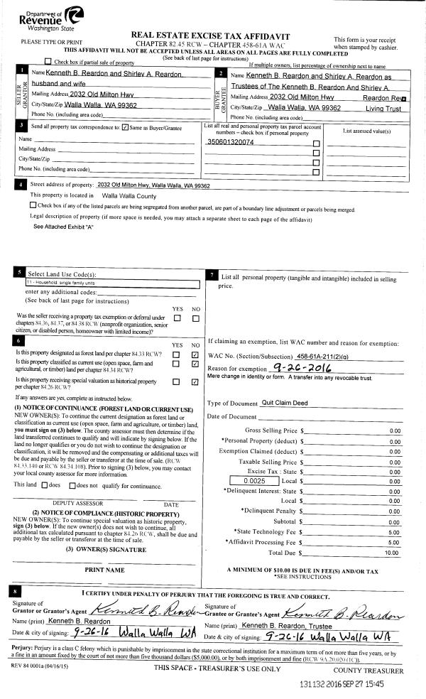 | 1 | 09/26/2016 | QCD | QUIT CLAIM DEED | REARDON KENNETH & SHIRLEY | REARDON KENNETH B & SHIRLEY A REVOCABLE LIVING TRUST | | | $0.00 | 131132 | 2016-07943 |