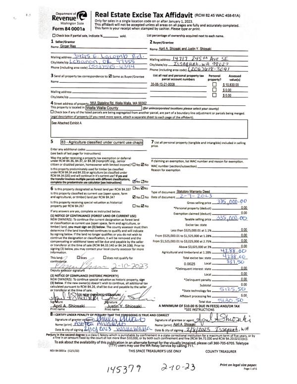 | 2 | 02/10/2023 | SWD | STATUTORY WARRANTY DEED | RIES GINGER | SHIOSAKI APRIL A & JUSTIN Y | | | $335,000.00 | 145379 | 2023-00687 |