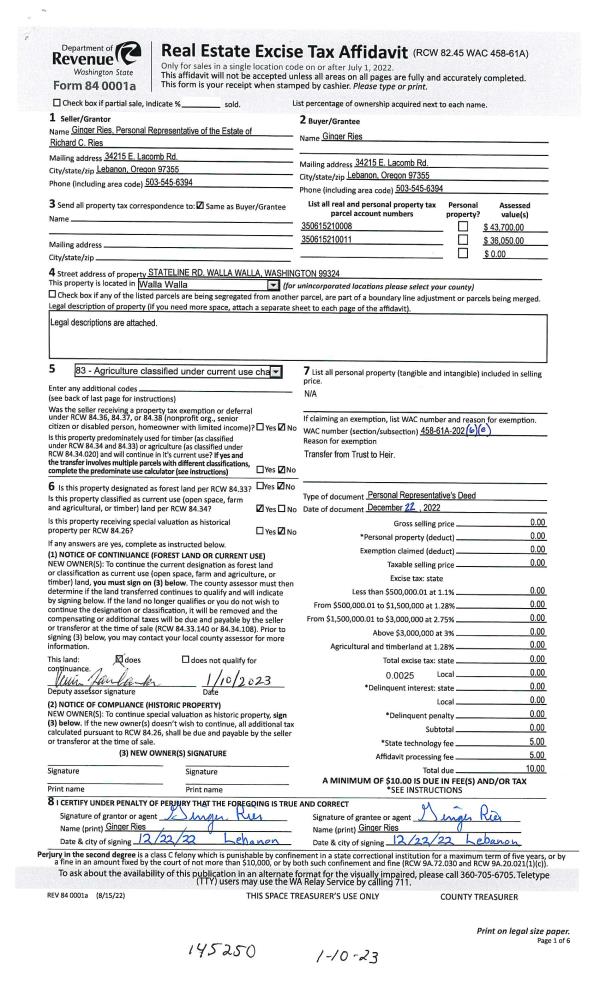 | 2 | 01/10/2023 | DPR | DEED OF PERSONAL REPRESENTATIVE | RIES RICHARD C ESTATE OF | RIES GINGER | | | $0.00 | 145250 | 2023-00152 |